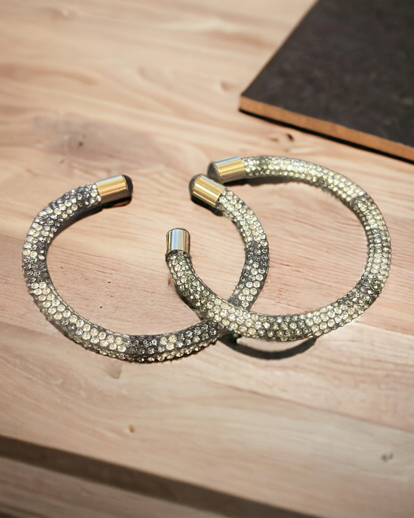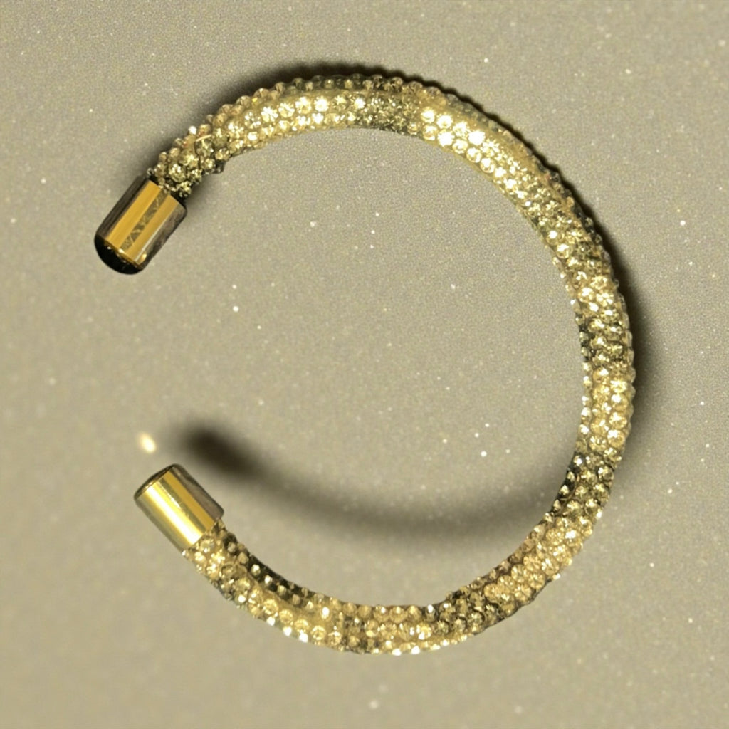 This stunning open-cuff bracelet features a sleek, curved silhouette fully encrusted with sparkling rhinestones for nonstop shine. The rich gold-tone crystals catch the light beautifully, creating a luxe, high-glam look. Finished with smooth metallic end caps, the open design allows for easy wear while giving a bold, polished statement. Perfect worn alone or stacked, this bracelet adds instant elegance and sparkle to both casual and dressy outfits.