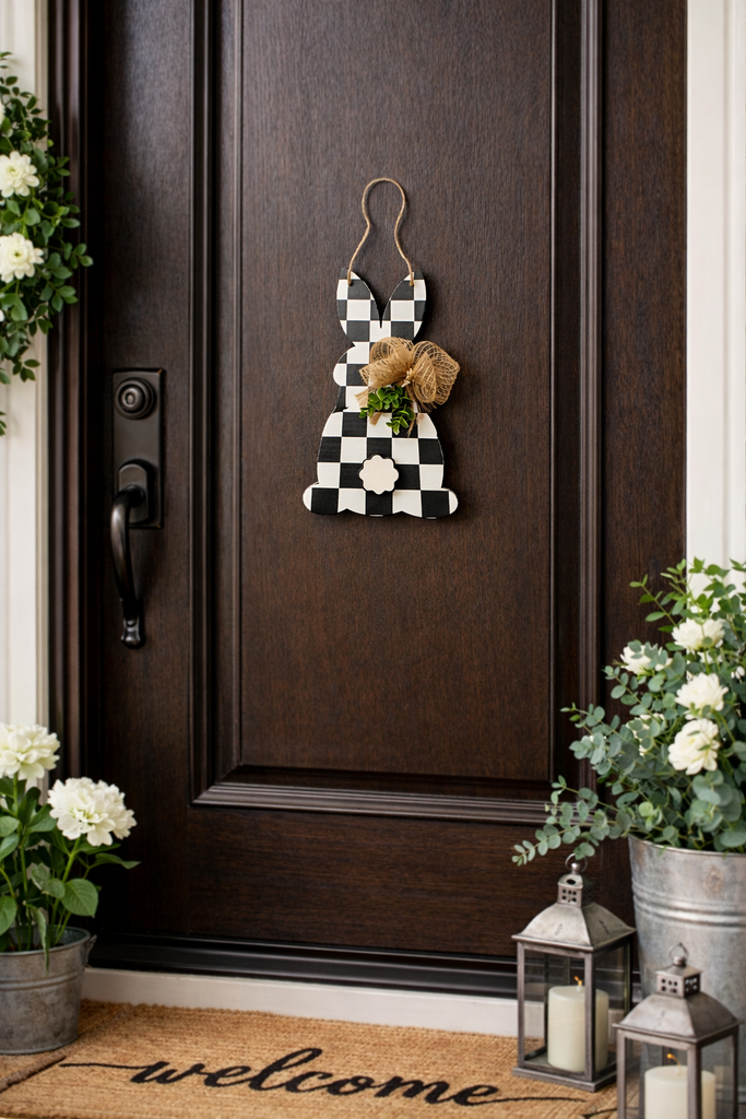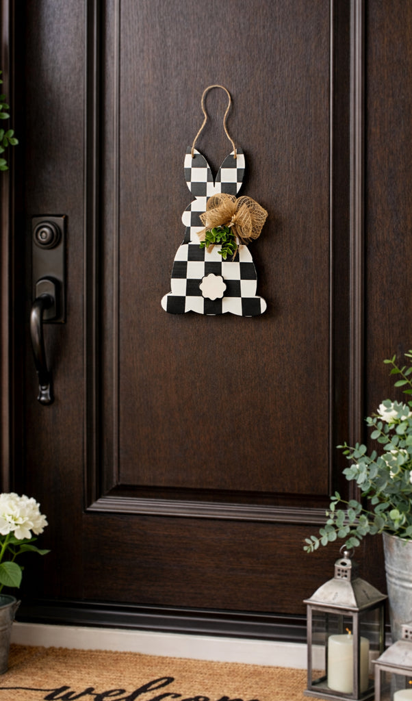 Add the perfect touch of cozy farmhouse charm to your front door with this adorable buffalo check bunny door hanger. Featuring a classic black-and-white check pattern, a rustic burlap bow, and soft greenery accents, this bunny brings timeless style with a warm, welcoming feel.