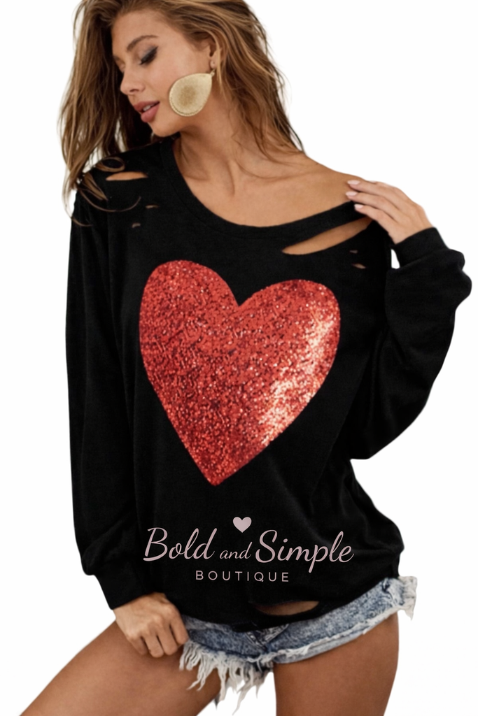 Bold, flirty, and full of sparkle. This black off-shoulder top features a stunning red sequin heart with edgy distressed details for the perfect mix of glam and attitude. Soft, comfy, and effortlessly cute—just slide it off one shoulder and go.
