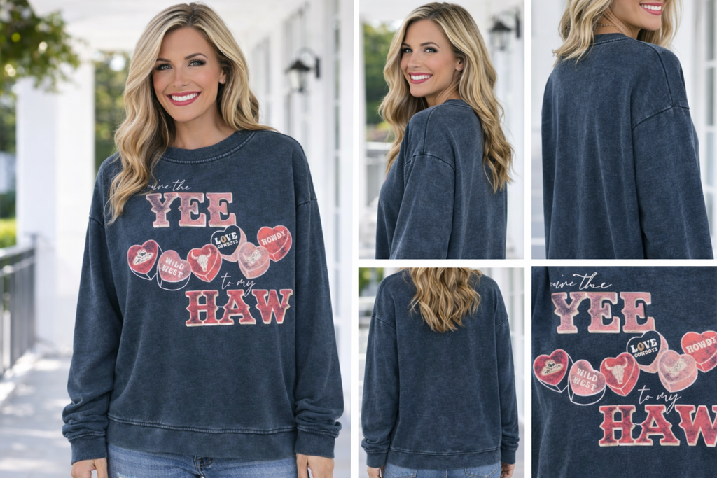 Add a little western charm to your Valentine style with our You’re the YEE to My HAW Sweatshirt. Featuring a vintage-washed navy crewneck and playful western-inspired candy heart graphics, this cozy pullover is equal parts cute and comfy.